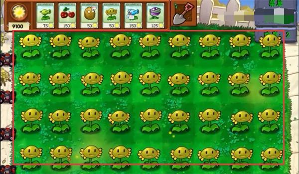 1、在草地場景,先種向日葵產出陽光,再選豌豆射手等攻擊植物,布置防線阻攔僵尸。