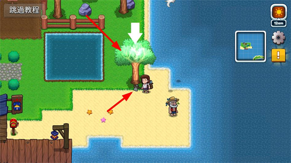 4、完成釣魚目標后,在海濱場景移動角色靠近樹,用斧頭砍樹獲得木材,推進游戲的冒險進程。