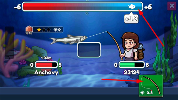 3、釣魚的過程點擊對應按鈕操控釣竿,推動進度條向右側移動,爭取讓進度條到達右邊緣,成功釣到魚獲取獎勵。