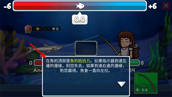 2、釣魚時需關注魚的抵抗力進度條,魚會向左拉進度條,若進度條到左邊緣則失敗,到右邊緣則成功,按提示操作釣魚。