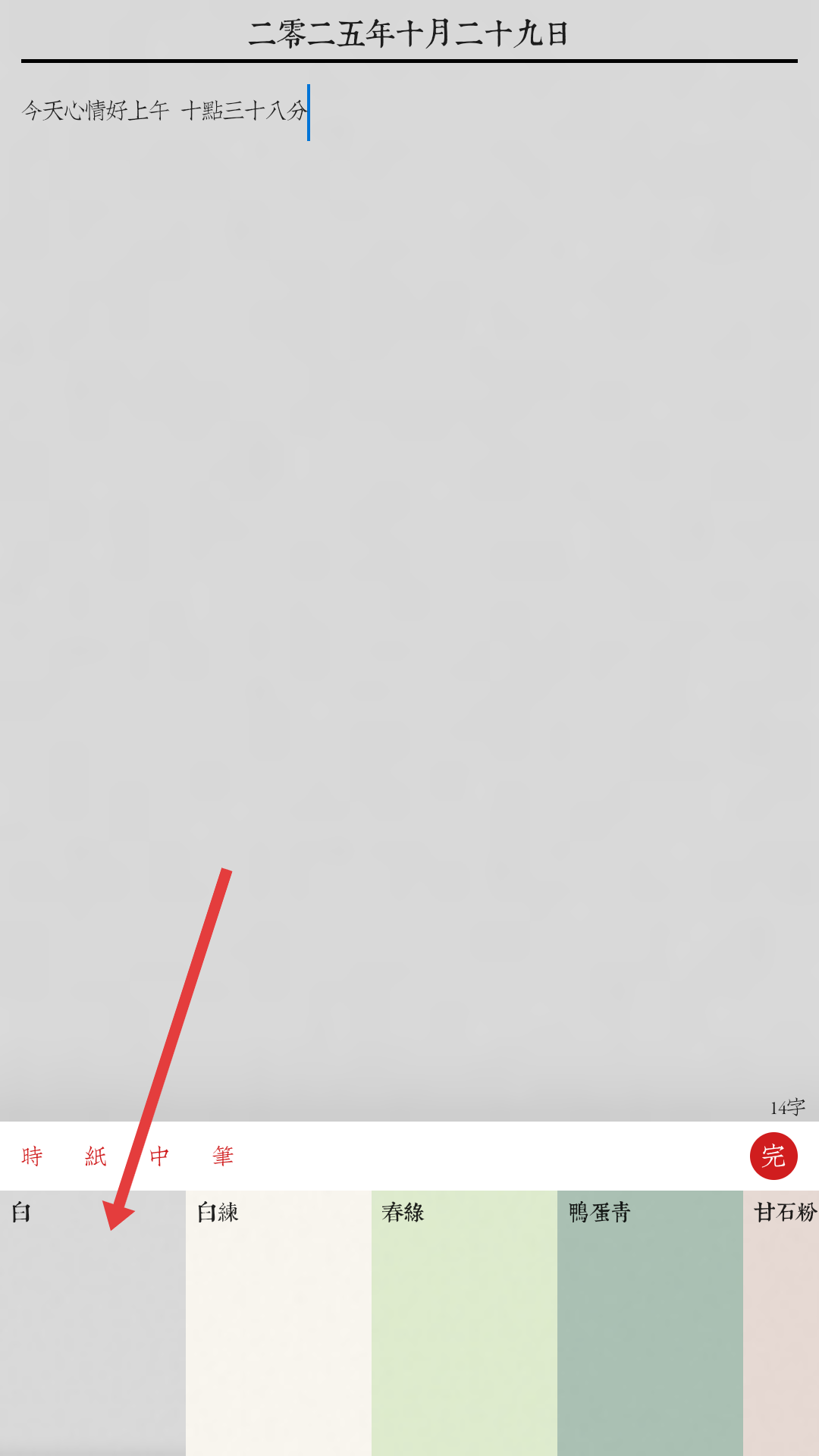 2、日記編輯界面,點擊底部紙選項,可選擇不同的紙張樣式,如白、白練、春綠等,調整日記的顯示風格。