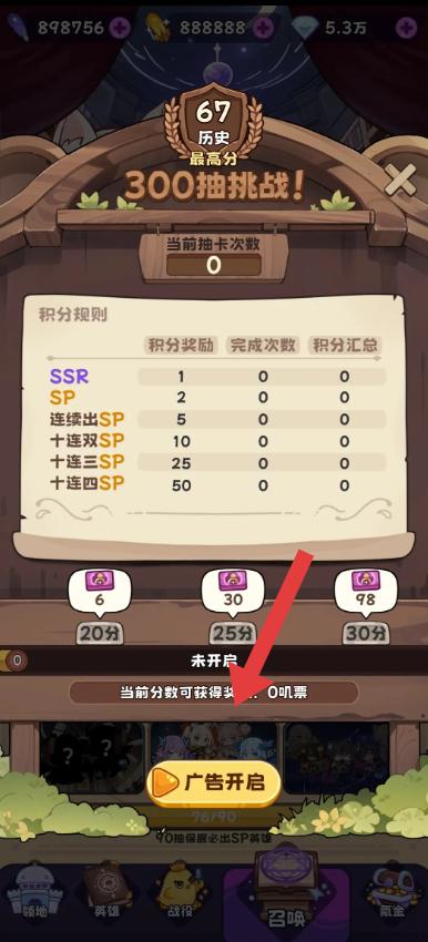 3、進入300抽挑戰界面,查看積分規則與獎勵,點擊廣告開啟觀看廣告獲取挑戰次數或獎勵,積累積分兌換道具。