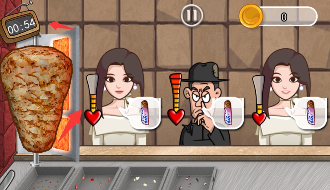 1、一進游戲先選要闖關還是開店,跟著教學把烤肉卷餅的流程走一遍,馬上就有客人上門點單了。