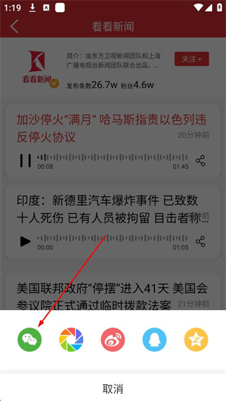4、在新聞播放頁面點擊分享選項,可選擇微信、朋友圈、微博等分享方式,將新聞分享給他人。