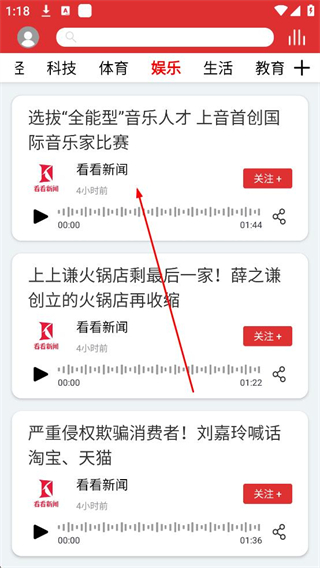 2、進入APP后選擇娛樂分類,可看到多條娛樂新聞,點擊感興趣的新聞如選拔全能型音樂人才上音首創國際音樂家比賽,即可進入新聞詳情頁面。