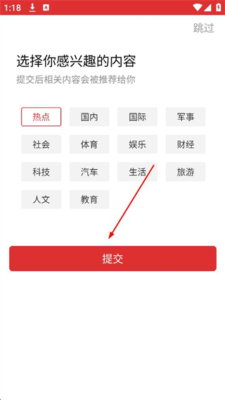1、打開APP選擇感興趣的內容分類如熱點、國內、國際等,點擊提交,即可完成興趣選擇,獲取相關內容推薦。