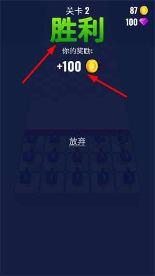 4、關卡2勝利后,獲得100金幣獎勵,界面顯示獎勵內容,點擊放棄即可結束當前關卡流程,準備進入后續關卡。
