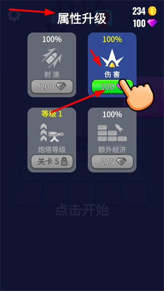 2、進入屬性升級界面,可升級射速傷害等屬性,點擊傷害對應的按鈕,消耗100鉆石就能提升傷害屬性,增強炮塔的攻擊能力。