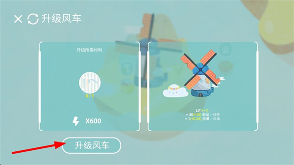 1、進入升級風車界面,查看所需材料和能量,滿足條件后點擊升級風車按鈕,即可提升風車等級,增加能量產出效率。