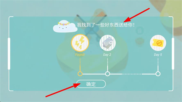 2、看到云朵贈送物品的界面,顯示不同天數的獎勵,當前可領取對應物品,點擊確定按鈕,獲取該獎勵并繼續游戲。
