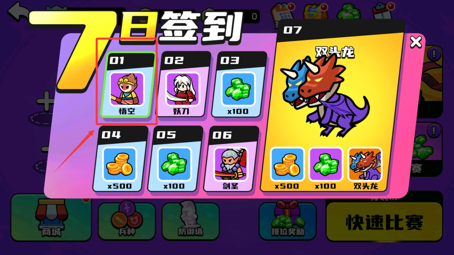 2、在主城界面左側找到"7天簽到福利"圖標,進入后點擊"7日簽到"標簽,當日獎勵會自動彈出并伴有金幣灑落特效。