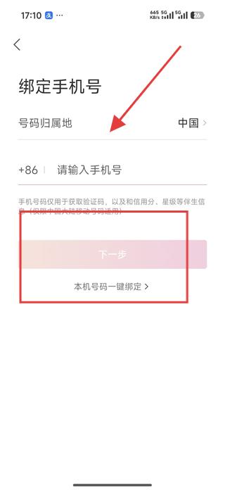 3、進入綁定手機號頁面,選擇號碼歸屬地為中國,輸入手機號,點擊下一步。