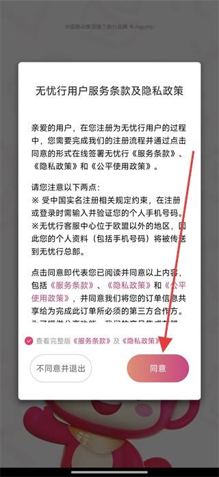 2、在用戶服務條款及隱私政策頁面,點擊同意按鈕,進入綁定手機號頁面。