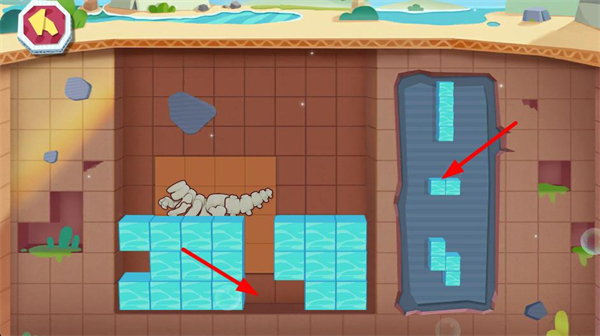 1、先觀察場景里的石塊和水域布局,移動水域方塊來調整位置,為露出下方的恐龍化石騰出空間,逐步清理出化石的部分區域。