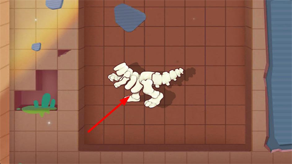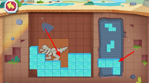 2、繼續調整不同位置的水域方塊,讓更多的恐龍骨骼顯現出來,同時避開石塊等障礙,慢慢拼湊出化石的大致輪廓。