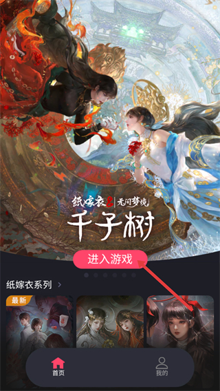 1、看到帶有精美畫面的啟動界面,點擊進入游戲,還可查看紙嫁衣系列最新作品,選擇進入游戲開啟解謎之旅。