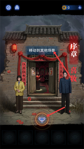 3、進入帶有中式建筑的場景,顯示序章喜妝,可移動到其他場景,點擊下方圖標進行場景切換,探索不同場景尋找線索。