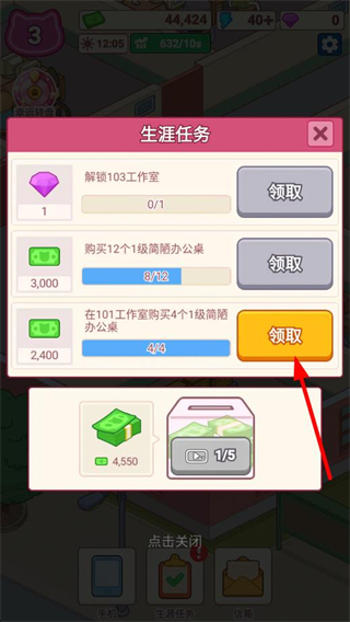 3、完成生涯任務可領取獎勵,如在101工作室購買4個1級簡陋辦公桌,完成后點擊領取可獲得相應獎勵,推動任務進度。