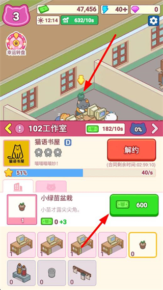 4、可裝修新的工作室,如102工作室,可購置小綠苗盆栽等裝飾,花費600打造更優辦公環境,同時開展新的業務合作。