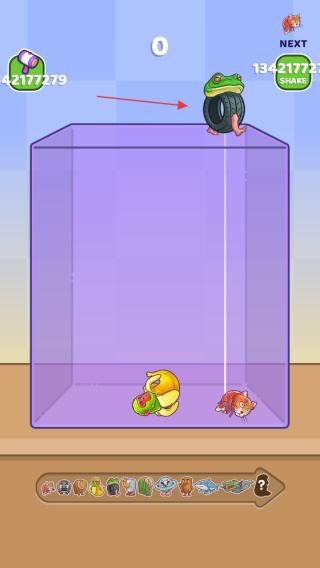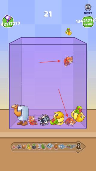3、容器上方再次出現帶香蕉的猴子,其落入容器后,與已有角色聚集,界面數值發生變化,持續推進合成進程。