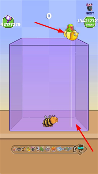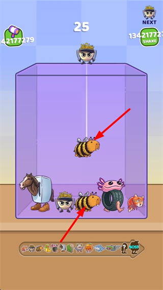 4、新的蜜蜂角色落入容器,與下方相同的蜜蜂角色相遇,觸發合成操作,界面數值提升,完成本輪合成步驟。