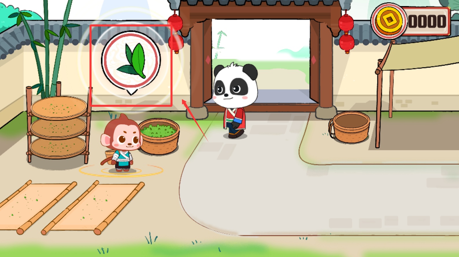 2、接著將角色引導至灌木叢生的種植區域,注意觀察畫面邊緣閃爍的綠色光效。當人物靠近枝繁葉茂的茶樹時,畫面上方會出現半透明的操作指引。