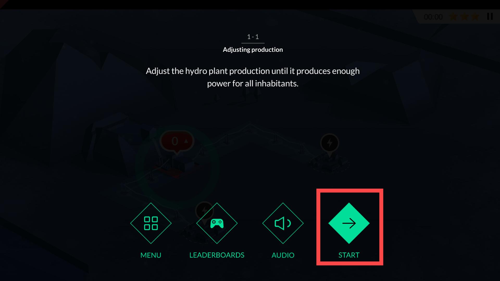 1、進入游戲關卡界面,閱讀任務說明,明確需調整水力發電廠產能,點擊START按鈕,加載場景準備操作。