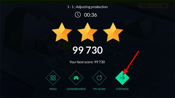 3、完成關卡后獲得三星評價與對應分數,點擊continue按鈕進入下一個關卡,繼續進行電力線路的搭建挑戰。