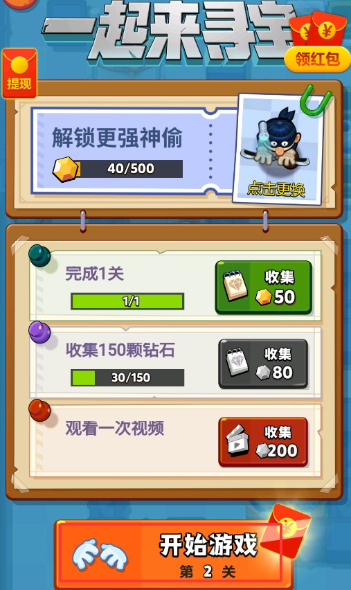 一起來尋寶是個挺有意思的偷東西游戲,扮演小偷去搞寶貝。得先看保安怎么巡邏,找機會溜進去,解開機關拿到好東西再跑路。關卡每次玩都不一樣,偶爾還能撿到紅包獎勵。畫面是搞笑卡通風格,音效也很逗。難度會自己調整,手殘黨也能玩得開心。