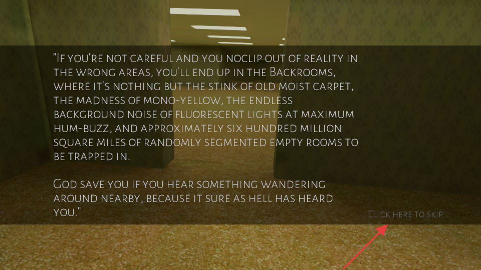 3、遇到背景故事文本彈出,快速點擊跳過,持續深入后室的房間迷宮,努力完成初始關卡設定的目標,嘗試解鎖全新的神秘內容。