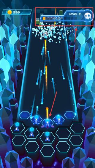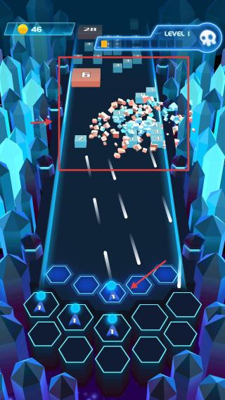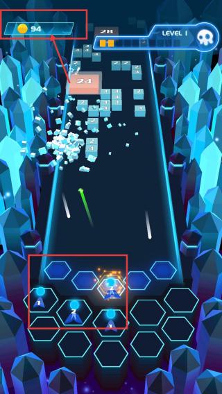 1、玩家進入后,在關卡1中,點擊下方帶A的六邊形,發射子彈擊碎軌道上的方塊。