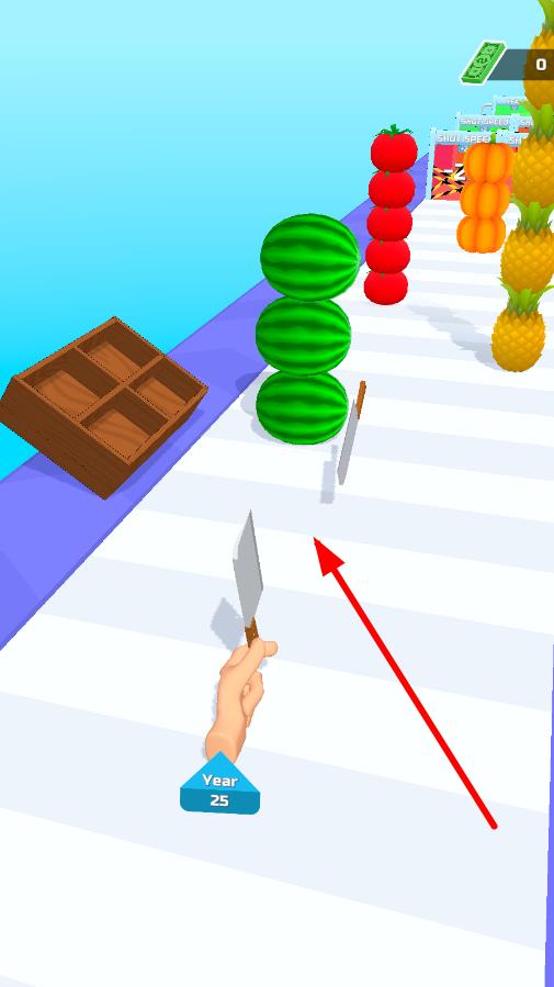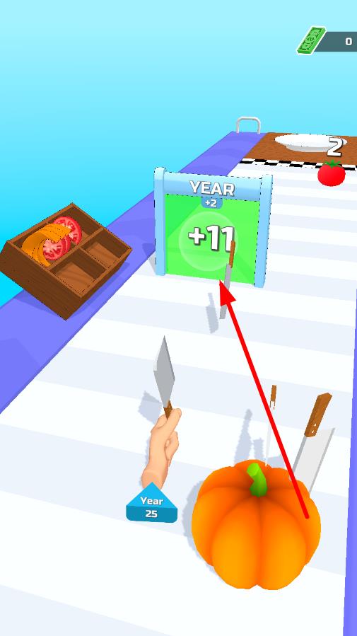 2、沿著賽道前進并投擲飛鏢,精準切割遇到的食材,留意賽道上標有YEAR等字樣的道具牌,獲取額外的獎勵或加成,不斷積累分數。
