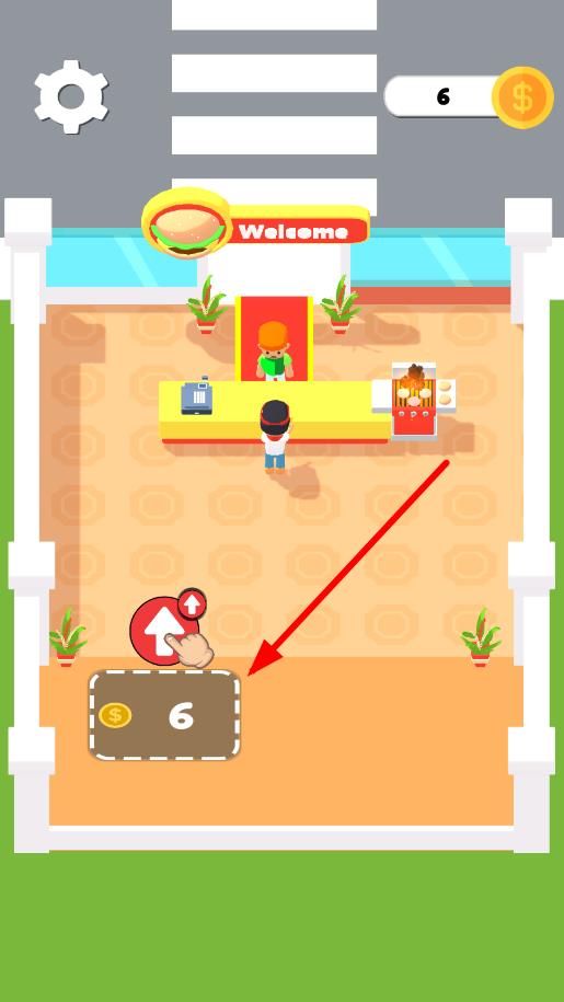 1、進入游戲,跳轉至快餐店初始場景,顧客在前臺等待,畫面下方出現帶金幣與數字的訂單標識,點擊即可收取訂單、確認顧客需求。