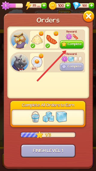 2、在訂單界面,完成顧客的訂單,點擊【Complete】按鈕,獲取相應的獎勵。