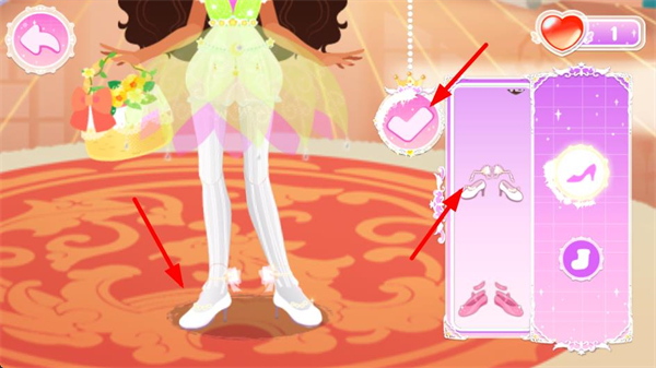 4、在鞋子選擇面板,點擊喜歡的鞋子款式,即可為角色更換鞋履,搭配完成后可查看整體效果,打造完整的公主裝扮。