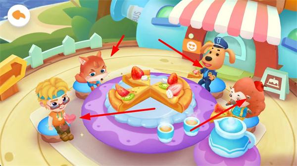 4、將烤好的披薩擺放到餐桌上,邀請角色們享用,完成披薩制作的全流程,開啟美食分享環節。