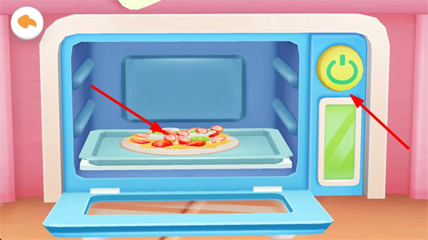 3、把裝飾好配料的披薩放入烤箱,點擊啟動按鈕開啟烤制流程,等待披薩完成烹飪。