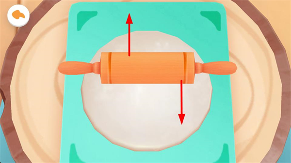 1、操作搟面杖,將面團搟成平整的餅狀,完成披薩餅底的初步制作,為后續添加配料做準備。