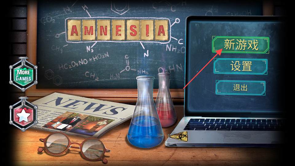 1、進入主界面,看到黑板寫有化學公式、擺放燒瓶與筆記本電腦的場景,找到筆記本電腦上的新游戲選項,點擊它,正式開啟佳作劇情。