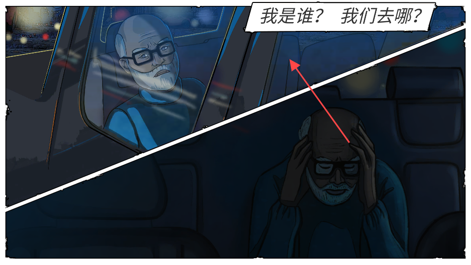 2、游戲加載后,出現漫畫式分鏡,聚焦車內,一位老者面露困惑,上方有文字,跟隨這一情節,推進角色探索進程。