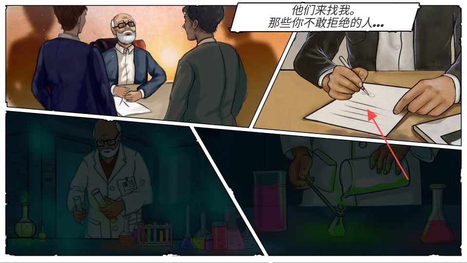 3、接著劇情推進,漫畫呈現新場景,有對話同時展示簽字、實驗室操作畫面,依據這些線索挖掘游戲背景。