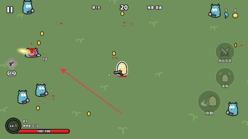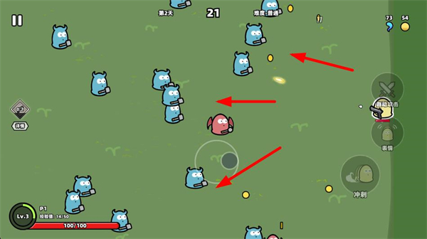 1、操控粉色萌怪,利用自動攻擊等技能擊敗周圍藍色怪物,收集場景內的金幣,同時提升經驗等級,推進第2天的生存挑戰。