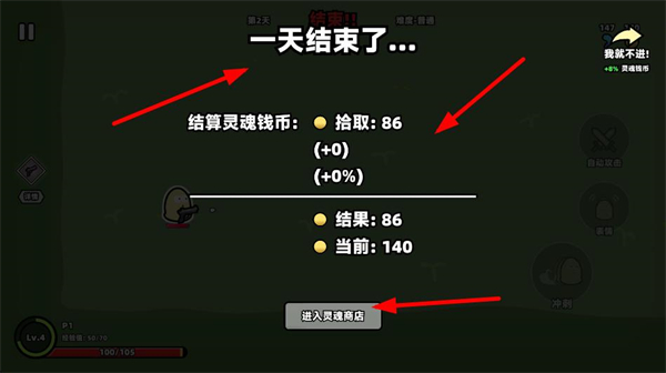 2、一天結束后進入結算界面,查看拾取的靈魂錢幣數量,當前靈魂錢幣會更新,可選擇進入靈魂商店,用錢幣兌換道具提升能力。