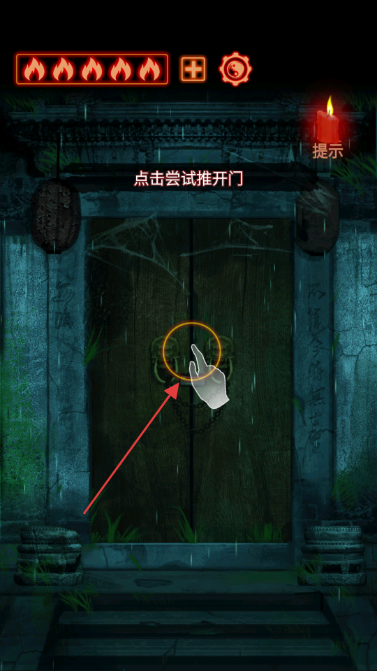 2、在面對木門時,按照提示點擊門上的門環位置,嘗試推開木門,探索門后的游戲區域。