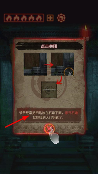 1、看到提示,得知爺爺常把鑰匙放在石墩下,需挪開石墩找大門鑰匙,查看信息后點擊關閉該界面準備操作。