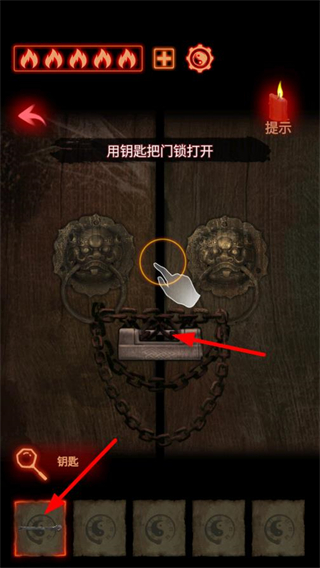 3、選好道具欄里的鑰匙,找到大門處的鎖,按照提示用鑰匙操作門鎖,嘗試打開大門以推進游戲進程。