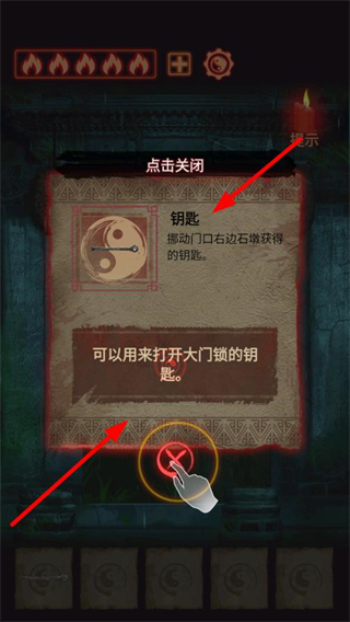 2、看到鑰匙的說明界面,了解其是挪動門口右邊石墩獲得,可打開大門鎖,查看后點擊關閉界面,準備使用該鑰匙。