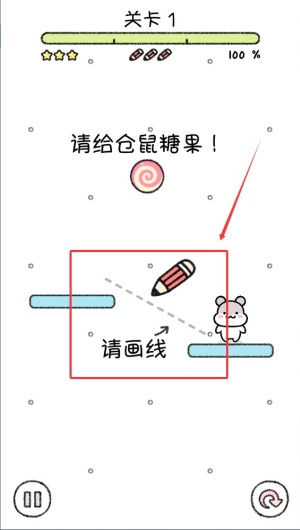 1、基礎路線繪制操作教學:使用手指在屏幕上自由畫出最優路徑,智能引導倉鼠角色順利拿到目標糖果獎勵。