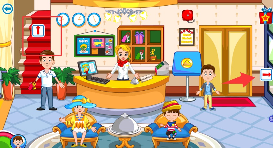 2、游戲里到處都有小箭頭提示,點它們就能查看酒店不同區域,想逛哪兒就逛哪兒。