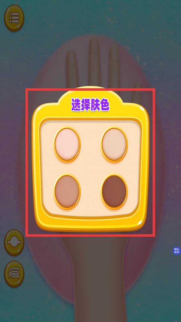 3、若需個性化設置,在流程中觸發選擇膚色彈窗,彈窗提供四種膚色選項,點擊對應膚色按鈕,選定后應用到手部模型,繼續后續護理或裝飾操作,完善手部美容效果。